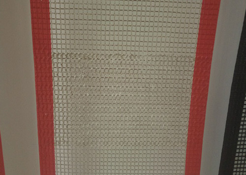 2.墻式接頭法:在網(wǎng)帶的兩頭分別用凱夫拉高溫布做圓柱狀的布條子,客戶也是直接用我們配好的鋼絲直接穿進(jìn)凱夫拉高溫布的小孔里面就行了。這種接頭方式的好處就是接頭處很耐磨,但是抗拉強(qiáng)度并不是很高。