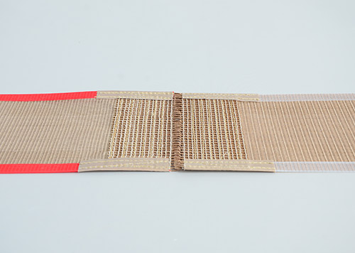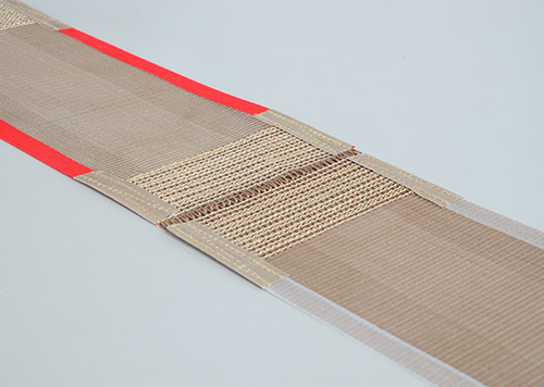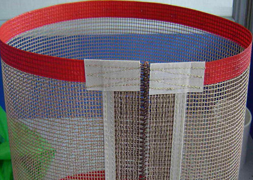 2.墻式接頭法:在網(wǎng)帶的兩頭分別用凱夫拉高溫布做圓柱狀的布條子,客戶也是直接用我們配好的鋼絲直接穿進凱夫拉高溫布的小孔里面就行了。這種接頭方式的好處就是接頭處很耐磨,但是抗拉強度并不是很高。